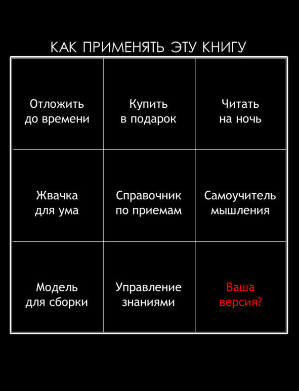 Я вам не расскажу о том, как создать инновационную идею, привлечь инвестора и заработать миллион. Вы также не узнаете из этой книги, как повысить конверсию сайта или завоевать друзей в Facebook. И конечно я не смогу подсказать вам, где искать и как поймать Покемона. Я не предлагаю вам ничего купить и даже не собираюсь вас побуждать работать головой и что-то создавать.