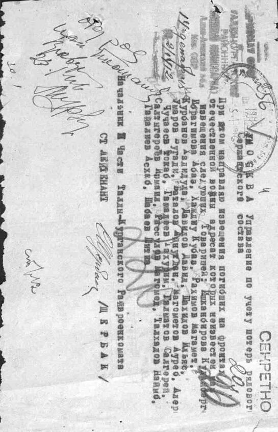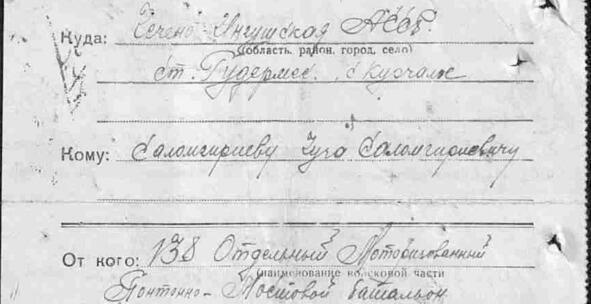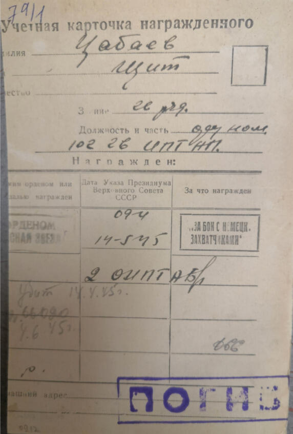 Лист 12. Шидаев Айс Укаевич, В Красной Армии с сентября 1939 года, 1919 года рождения, Ачхой-Мартановский район, село Шалажи, чеченец, член ВЛКСМ с декабря 1942, образование 4 класса, курсы младших командиров в г. Архангельск с 1.11.1939 года по 1.05.1940 г., служил в 27 гвардейской стрелковой дивизии, 74 гвардейский стрелковый полк, ранения: 29.07.1941 года Западный фронт, Февраль 1942 года Западный фронт, 27.05.1943 года 3-й Украинский фронт, последнее ранение Операция «Багратион» 3.08.1944 года, 27.08.1944 умер в госпитале от многочисленных неизлечимых ран.