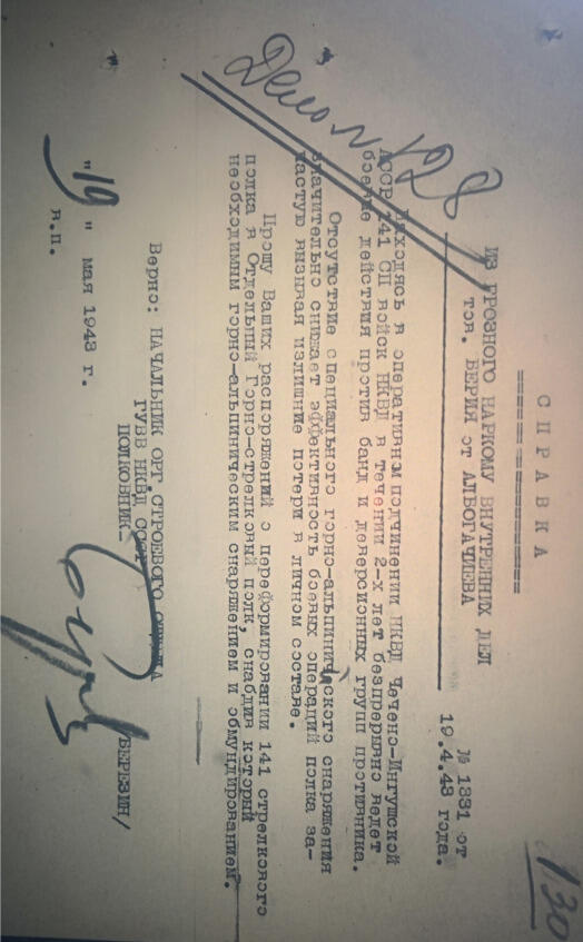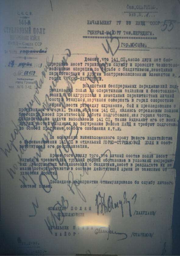 141 горно-стрелковый полк Внутренних войск НКВД СССР. Оперативные планы, боевые приказы по полку, донесения, оперативные сводки.