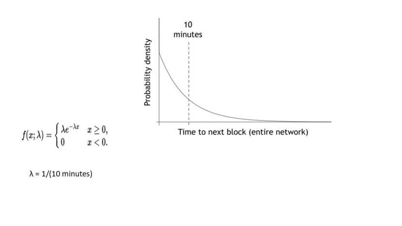Конечным результатом всего этого является то, что функция плотности вероятности, которая показывает относительную вероятность времени, пока не будет найден следующий блок, выглядит следующим образом.