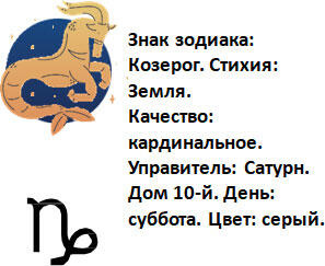 Козерог знак зодиака относится к стихии Земли, что делает его практичным и приземленным. Сосредоточенный на материальном мире, он сух и прагматичен. Знак символизирует время сложностей, дисциплину и ответственность. Человек, рожденный под этим знаком, целеустремленный и стойкий к различного рода жизненным трудностям. Нет такой задачи, с которой он бы не справился. Этот знак отвечает за профессиональную деятельность человека. Для того, чтобы стать профессионалом, надо научиться себя ограничивать, ставить рамки, приоритеты, быть дисциплинированным, упорным в труде. Поставив цель идти вперед, несмотря на сложности, препятствия. Что он и делает, учась на своих ошибках, способен добраться до вершины, а потом начать все заново, что-то новое, как «горный козел», неустанно карабкается верх. Человек, рожденный под этим знаком, обладает такими качествами, как уверенность в себе, ответственность, самоконтроль, настойчивость, терпение. Правящая планета Козерога Сатурн, символизирует порядок и закон, ограничения всех видов. Оголяя слабые места человека, придавая жесткую форму, Сатурн заставляет навести порядок, исправиться. Его влияние делает человека ответственным, практичным, достигающим результата. Гордость и самоуверенность такого человека нередко приводит к конфликтам с окружающими его людьми.
