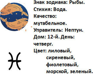 Рыбы это знак стихии Воды, эмоциональный и чувствительный. Символизируют идею сливания, объединение всего в целое, интуицию, психологию, глубину, творчество. Самый творческий знак зодиака, размывающий все границы. Человек, рожденный под этим знаком творец. Его творчество чистое, не имеет формы, в нем нет логики. Планета Нептун, находясь у себя дома в знаке Рыб, создает иллюзию, размывает сознание. Такой человек интуитивен, с глубоким внутренним миром, обладает художественным талантом, врожденный творец. Щедр, сострадателен и чрезвычайно верный и заботливый. У такого человека хорошо развита интуиция, обладая ею, не задумываясь, понимает жизнь, достигая наилучших эмоциональных отношений с другими людьми, может почувствовать, если что-то идет не так. Он мудр, терпелив, очень душевный. Любит одиночество, духовные практики, эзотерику, музыку, искусство. Очень дружелюбен, поэтому часто оказывается в компании разных людей. Бескорыстный, он всегда готов помочь другим, не надеясь получить что-либо взамен, альтруист.