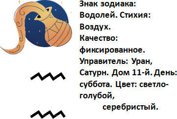 Водолей воздушный, стабильный знак, символизирующий озарение чего-то нового, оригинальность, новаторство, а также революционность и чувство свободы. Водолей знак будущего, знак идей. Человек, рожденный под этим знаком, смотрит на мир как на место, полное возможностей. Правящая планета Водолея Уран придает человеку дар предвидения, способность видеть будущее, а также делает его революционером, жаждущим перемен. Из-за стремления к свободе и равенству для всех он всегда в борьбе за свободу слова, за мир без границ. Такой человек также имеет способность быстро и легко преобразовываться, меняться. Является глубоким мыслителем и интеллектуалом. Имеет гуманитарный склад ума. Новые изобретения, прорыв, космос, интернет это то, что относится к знаку Водолея. Он хорошо себя чувствует, будучи окруженным людьми, среди новых знакомых. Открытый, коммуникабельный человек, имея хорошее воображение и готовность к риску проявляет себя в новациях. Любит веселиться с друзьями, помогать другим, интеллектуальные беседы, хороший слушатель.