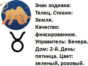 Телец самый стабильный знак во всем гороскопе. Земля символизирует основательность, практичность и материальность. Он не любит внезапных перемен и изменений. Телец это человек, который пожинает плоды своего труда. Он чувствует потребность всегда быть окруженным любовью, красотой и гармонией. Человек обращен к материальному миру и физическому удовольствию. Земное влияние делает его материалистичным. Правителем Тельца является Венера планета любви, красоты, удовольствий и творчества. Человек под этим знаком любит материальный комфорт (мягкий диван, вкусную еду). Телец земной знак, и он умеет видеть все с практической точки зрения, и его взгляд всегда заточен на результат и накопительство. Он хороший сотрудник и долгосрочный партнер. Он всегда открыт для людей, которых любит, и постоянен в дружбе. Луна в экзальтации делает его нежным и эмоциональным, а также реализует его в творчестве. Он может реализовать себя и стать хорошим поваром, а в любви нежным, чувственным любовником. Не реализовав себя, может стать эмоциональным нытиком и лить «телячьи слезы». Он испытывает стресс, переходя с одного вида деятельности на другой. Ему трудно приспособиться к новой обстановке. Он не готов к быстрым изменениям в любой деятельности, не любит никаких трансформаций и перемен, избегает революций (Уран в падении, Плутон в изгнании). Он стабилен, медлителен и ленив.