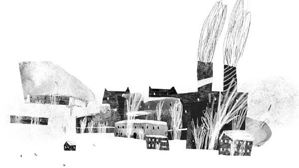 Прямо за окном белые силуэты деревьев, за ними двухэтажные домики. Справа завод с двумя высоченными трубами. Дым из них обычно идет вертикально в небо пушистый, светло-желтый, а в ветреные дни стелется горизонтально, закрывая половину неба. Алеше нравится представлять, что это гигантские хвосты двух котов. Сами коты небольшие: их тела умещаются в кирпичных коробках завода. А вот хвосты На заводе работает Алешин папа: варит металл.