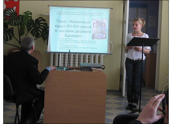 Мария Лубчук доложила о проведённом исследовании каменного составного креста, расположенного в разрушающейся часовне в д. Адамово.