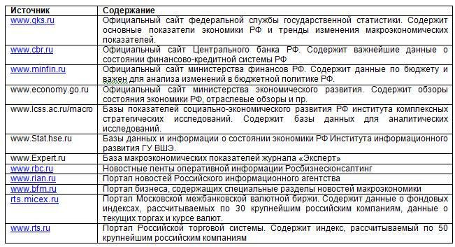 Немаловажную роль в понимании макроэкономических процессов, которые могут оказать влияние на деятельность фирмы, оказывает доступность источников информации. Нет информации нет возможности сформировать модель и заложить в нее количественные показатели нет исследования. Изучая информацию, мы стремимся найти сигналы, а затем и достроить картину происходящего. Это дает возможность спрогнозировать сценарии дальнейшего развития событий. Полезные источники макроэкономической информации РФ приведены в табл.3.1.