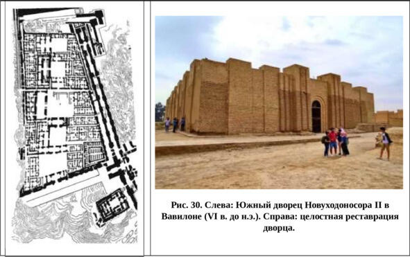 Примером ассирийского дворца служит дворец Саргона II в ДурШаррукине (712707 гг. до н.э.)39 (рис. 29). Он состоял из трех частей: собственно дворца, жилых покоев царя и его семьи, хозяйственных и служебных помещений. По сторонам входов во дворец были установлены гигантские статуи крылатых быков добрых духов-хранителей. Во внутренних помещениях дворца были открыты остатки панели, сложенной из разноцветных поливных изразцов с изображениями священных предметов и следы стенных росписей. Помещения дворца, как правило, были узкими, длинными и высокими. Нижние части стен парадных залов облицовывались рельефными каменными плитами ортостатами40.