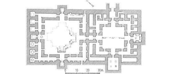 Чрезвычайно интересна в этот период архитектура Центральной Азии, которой характерна общность строительно-технических приемов в разных районах региона. Как ранее, они связаны с применением местных материалов, особенно глины (пахса и сырец). В монументальном зодчестве широкое распространение получают своды, появляется купол на угловых парусах (тромпах). Во внешнем облике зданий и сооружений царит суровая простота объема и форм. Все богатство архитектурного декора раскрывается в интерьерах парадных дворцов правителей Бухарской области (бухар-худата Буниата в Варахше), самаркандских правителей-ишхидов на Афрасиабе, уструшанских афшинов в Бунджикате и др. Среди культовых сооружений Средней Азии VVII вв. значительный интерес в архитектурном отношении представляют буддийские комплексы в Тохаристане, Фергане, Семиречье. В этих постройках ясно проступает отстоявшийся архитектурный тип буддийского монастыря с одним или двумя дворами в окружении келий, молитвенных помещений, святилищ, интерьеры которых насыщены живописью и скульптурой. В Ак-Бешиме на оси продолговатого двора в обводе келий высится сводчатый айван, в Аджинатепа оба двора в обводе келий имели сводчатые айваны на осях. Как подчеркивает Г.А.Пугаченкова, такая композиция предвосхищает структуру мусульманских мадраса Центральной Азии22 (рис. 16).