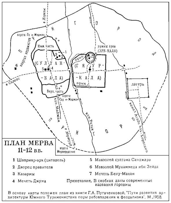 Рис.19. План Термеза XI XII вв.: 1-Арк; 2-Первый шахристан; 3-Второй шахристан; 4-Первый рабад; 5-Второй рабад; 6-Пригород (по С.Г.Хмельницкому).