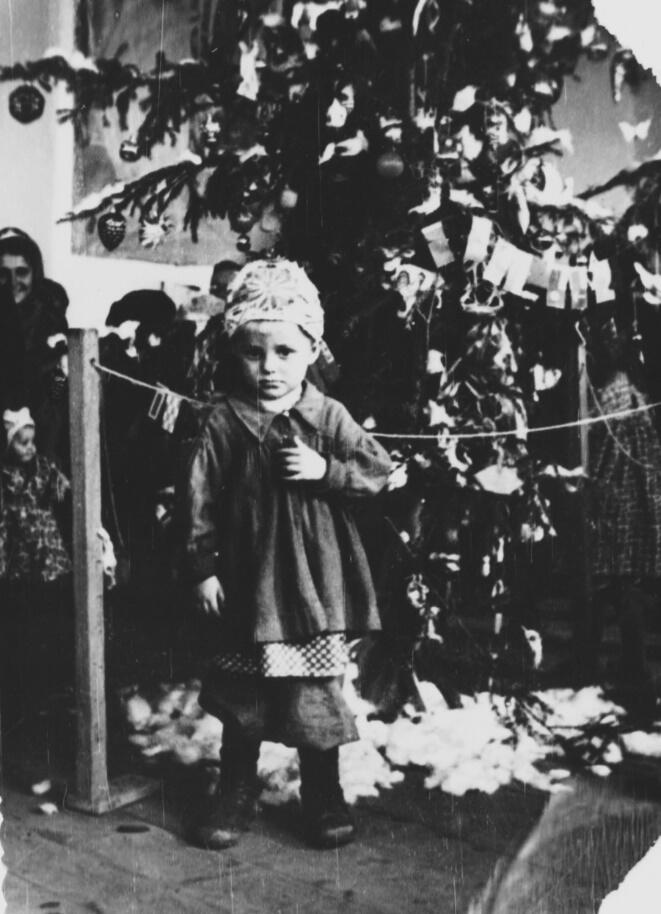 Повели на елку в школу, где училась старшая сестра. На мне одежда в несколько ярусов. Короткая кацавейка, из-под неё видно платье в горошек, из-под платья байковые шаровары а-ля Тарас Бульба, потом ботиночки на шнуровке. Главное на голове это корона, обклеенная ватой и расшитая битыми елочными игрушками. Фотография у елки, на лице серьёзность, какую может позволить себе трехлетний ребёнок.