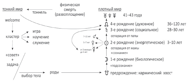 Мы собрались в путешествие героя, на главный формат тренинга личностного роста, доступного духовным существам. Тоннель, белый свет (Дхармакая или «Бардо Тодол» из «Тибетской книги мертвых») и погнали, пора забывать свое бессмертие и начинать простую земную жизнь. Как правило, это второй-третий триместр беременности для большинства, но считается, что чем важнее и ответственнее воплощение, тем раньше дух снисходит в плотный мир.