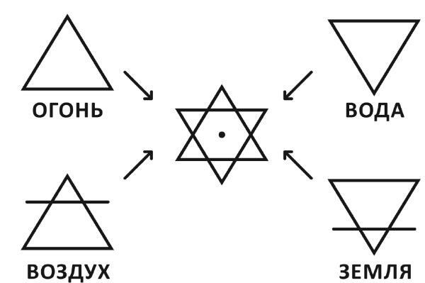 Из традиции алхимиков каждой стихии присваивается свой знак. В сумме они образуют шестиконечную звезду символ совершенства формы и завершенности мира.