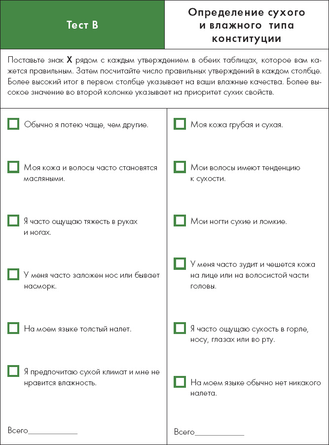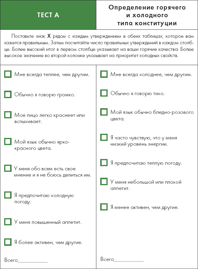 УЗНАЙТЕ СВОЮ КОНСТИТУЦИЮЧтобы помочь вам узнать вашу собственную конституцию, я создала два теста, которые помогут вам определить простые основы энергетики: горячее/холодное и влажное/сухое. Результаты подскажут вам вашу комбинацию термических показателей и показателей влажности, например: горячий/сухой, горячий/влажный, холодный/сухой или холодный/влажный. Помните, что это самые первичные данные личных конституций. Если вы придете к практикующему травнику, он, вероятно, проведет тщательное обследование, чтобы получить более точное понимание, к какому типу вы относитесь. Однако, начальные знания ваших особенностей, это все, что вам нужно, чтобы извлечь максимальную пользу из этой книги.