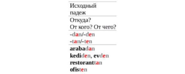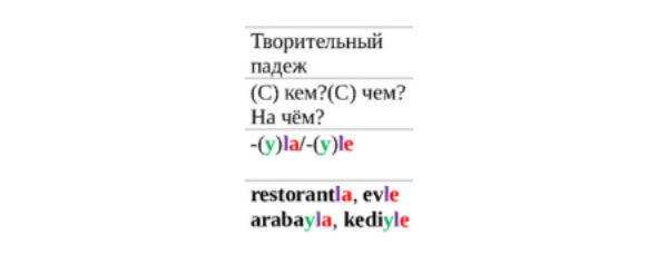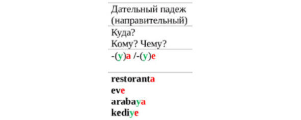 Otobüs (на автобусную) Otobüs(смена согласной +3 л. ед. ч. + направительный = дательный пад.) (остановку) Otobüs (я иду).