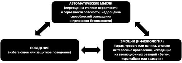 Таким образом, общим когнитивным фундаментом различных тревожных расстройств и «видов» тревоги является, с одной стороны, катастрофизация рисков (преувеличение вероятности и серьёзности опасности), а с другой недооценка ресурсов (внешних и внутренних) и признаков безопасности внутреннего (ощущение, мысль, чувство) или внешнего (объективная ситуация) стимула. Иными словами, тревога становится тревожным расстройством в результате искажённой когнитивной оценки рисков и ресурсов, что заставляет организм работать в избыточном формате, несмотря на отсутствие реальных опасностей, и призывает человека выживать в условиях мира, убегая от выдуманных угроз, сражаясь с ними или прячась от них. В силу наличия общего когнитивного фундамента тревожных расстройств терапевтические интервенции8, направленные на преодоление различных тревожных состояний, будут схожими и могут разниться лишь в аспекте работы со специфическими симптомами, присущими конкретному тревожному расстройству. В этой связи для любых тревожных расстройств будут актуальны такие терапевтические интервенции, как когнитивная реструктуризация (направленная на реалистичную оценку степени вероятности и серьёзности худших исходов и учитывание имеющихся внутренних и внешних ресурсов и признаков безопасности), а также преодоление избегающего и защитного поведения, лишающего человека возможности опытным путём проверить свои тревожные предсказания.