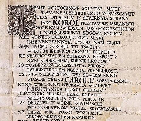 Репродукция стихотворения Спарвенфельда из плачевной речи по Карлу XI, написанная латинскими буквами по правилам латиницы.