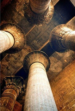 Чтобы предохранить тонкие края капители от давления тяжелой балки, часто между ними укладывалась дополнительная каменная плита, скрытая за «распустившейся» капителью. В результате египетская колонна как будто уподобляется гигантскому растению грандиозных масштабов, при этом вовсе не обремененному поддерживанием перекрытий. Создается впечатление, что эти колоссы не несут никакой тяжести, что колонна-«растение» сама по себе царственно пребывает в пространстве, а опирающаяся на колонну балка перекрытий существует вне могучей растительной формы, что перекрытие «парит» над колоннами (ил. 24).