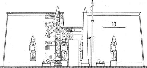 Перед пилонами, симметрично по отношению к оси входа (ил. 27 и 28), помещались колоссальные статуи царствующего фараона и высокие обелиски, два или четыре, с заостренными медными наконечниками-верхушками, сверкавшими на солнце.
