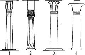 Это лотосообразная (лотосовидная, в форме лотоса) колонна (1), капитель которой напоминает стилизованный цветок лотоса с закрытым или открытым бутоном. Это папирусообразная (папирусовидная, в форме папируса) колонна (2): ее ствол представляет связку папируса с капителью в форме стилизованных цветов папируса бутонов или распустившихся. Это также пальмообразная (пальмовидная, в форме пальмы) колонна (3) с капителью в форме пучка стилизованных листьев пальмы. И, наконец, колоколообразная колонна (4) с капителью в форме «колокола».