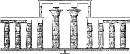 Свет в гипостиль поступал только через дверной проем из перистиля, и этого было явно недостаточно. Чтобы, сохраняя стены глухими, осветить зал для жрецов, колонны центральных рядов увеличили по высоте, благодаря чему появились потолки двух уровней: высокий в центре и более низкие по сторонам; в образовавшийся между ними просвет поступал свет (ил. 29).