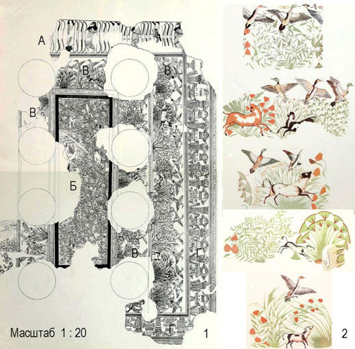 1. Схематический рисунок одной из двух симметричных частей.А проход между частями с поверженными врагами;Б пруд;В «берег» с растительностью, утками и бычками»;Г орнаментальный фриз с букетами. 2. Фрагменты изображения «берега»