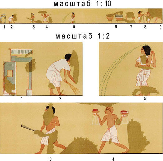 Открыватели этой живописи предположили, что речь идет о подготовке к приезду хозяина. Сначала (ил. 39, вверху, слева направо) видна открытая дверь (1); чуть поодаль служанка подметает пол (2), следуя за другой, которая обрызгивает пол водой (5). Между этими фигурами запечатлены торопящийся управляющий с палкой (3) и поспешающий за ним озабоченный, с поджатыми губами повар (4), в обеих руках он держит небольшие подставки с яствами. Еще дальше группа из двух больших украшенных чаш на подставках (6). Следующее изображение (7) из-за сильных утрат трудно интерпретировать. И сразу затем сцена, в которой посыльный сообщает привратнику о близости хозяина (8). Дальнейшее повествование разворачивается на соседней стене, поскольку в углу, на стыке стен, видны ноги приближающихся лошадей (9). Сохранилась еще только одна жанровая сцена, в которой слуга, зажав под левой рукой щетку, что-то объясняет, жестикулируя, сидящему перед ним на невысоком возвышении человеку. Из-за разрушений понять, как в этом помещении была декорирована стена выше, невозможно.
