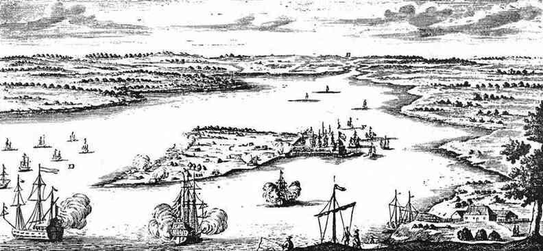 Остров Котлин и Невское устье. Гравюра датируется концом XVII в. и ошибочно названа «Вид на Петербург». Но, если судить по изображению, Петербурга еще нет и в помине, а флот, по всей видимости, шведский