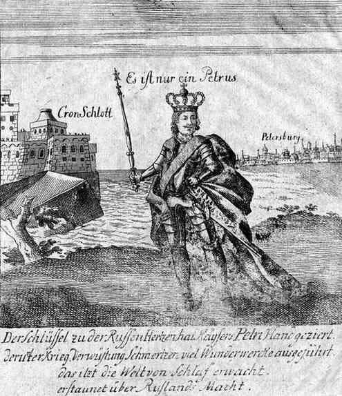 Как пример можно привести немецкую книгу, вышедшую в 1734 году во Франкфурте. В ней помещалась великолепная гравюра с Петром Великим, стоящим на фоне Кроншлота и Санкт-Петербурга. Сам царь довольно реалистично представлен в доспехах, обрамленных императорской горностаевой мантией, в короне и со скипетром в руке. Но форт Кроншлот напоминает не приневскую цитадель, а какую-нибудь мавританскую крепость на юге Испании. Единственное, что достоверно в этом изображении своеобразный «надолб», который перекрывает фарватер. Известно, что в 1706 году, в связи с активизировавшимися близ Кронштадта шведами, царь приказал завалить камнями удобные подходы к берегу.