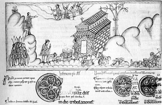 Перемены, произошедшие в самом принципе копирования во второй копии так называемой Псалтири Эдвина 11501170х годов (Cambrige, Trinity college, MS R. 17.1; илл. 3а), Ж.-П. Кайе связывает в первую очередь с изменением статуса рукописи: Псалтирь в эту эпоху, по его мнению, уже не просто «богослужебное орудие»[114], а поле для экзегезы. Концепция этой новой копии, автором которой является изобразивший себя на f. 283r монах Эдвин (Псалтирь Эдвина, 11601170, Кембридж, Тринити-колледж, MS R.17.1, f. 283r, 9), включает теперь три версии текста псалмов (галликанскую, римскую и еврейскую), сопровождаемые глоссами Кассиодора и Августина. В стиле миниатюр еще сохраняются следы очеркового стиля прототипа, хотя фигуративные изображения становятся более полихромными (а инициалы и вовсе приобретают «современный» вид многоцветных буквиц на золотом фоне), каждая сцена заключается в отдельную рамку, изначально многоплановые композиции протографа часто делятся на жесткие горизонтальные регистры. В иллюстрациях появляется отчетливый экзегетический акцент крестчатый нимб фигуры Творца, пояснительная подпись Sancta Ecclesia над зданием. В ряде случаев автор считает необходимым введение новых поясняющих персонажей, явно взятых из другого источника наподобие фигур Сарры, Агари и Измаила в миниатюре к псалму 5 («О наследующей»; f. 10r; 10), изображенных по обе стороны от Господа в мандорле до и после рождения Исаака и призванных стать комментарием к идее истинного наследования[115]. Показательная черта процесса копирования в середине XII века своего рода осовременивание всех сколько-нибудь значащих деталей, например архитектуры и одежд персонажей (в частности, священнослужители изображаются с тонзурами и в облачениях XII века).