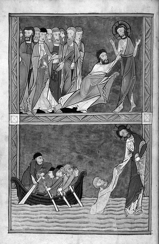 Описаны таким образом могли быть близкие, но не полностью совпадающие иконографически сцены. Очевидно, что «листы перед Псалтирью» служат в качестве иконографического руководства, но не с той степенью точности «факсимильного» воспроизведения, как в случае с копиями Утрехтской Псалтири, сам факт предложения мастеру одновременно для копирования двух источников разной степени подробности[131] предлагает определенную свободу выбора. Распространение такого рода текстовых руководств само по себе подразумевает знание мастером общих иконографических схем. Интересной иллюстрацией тезиса о роли памяти в следовании такого рода образцу (возможно, текстовому?) может послужить ошибка, допущенная миниатюристом так называемой Псалтири Хантера (ок. 1170 г., Glasgow University Library MS Hunter 229 (U.3.2))[132]. На одном листе в хронологическом цикле из 13 полнолистовых миниатюр, предшествующих тексту, помещены Уверение Фомы и Хождение по водам (f. 13v; илл. 4). Очевидно, что на этом месте в нарративном цикле предполагалось помещение иконографически сходного Чудесного улова в Галилее, события, происшедшего уже после Воскресения Христа. При этом изображение нагого и явно плывущего, как в галилейской сцене, а не идущего по воде Петра совмещено с жестом Иисуса, поддерживающего его, как в Хождении по водам. Чем вызвана эта ошибка самовольной «поправкой» мастера к визуальному образцу или следованием слишком общей текстовой инструкции, неизвестно, но в любом случае речь идет о смешении в его памяти двух иконографически близких сцен, что аналогично совмещению в описаниях Псалтирей Сигарда и Леоберта апелляции к зрительной памяти в отношении общей композиции с касающейся частностей инструкцией указанием точных второстепенных деталей.