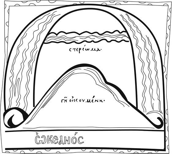 Нижняя часть фрески из базилики Сан-Джованни-а-Порта-Латина, изображающей Первый день Творения представляет Сотворение вод несколько иначе, чем в Перуджинской Библии. Здесь нет четырех потоков, и нижняя часть композиции сродни Vat. gr. 746, f. 24v. Жан Лассю[376] сравнивает эту ватиканскую миниатюру с одной из «карт мира» в «Христианской топографии» Косьмы Индикоплова, где два потока верхних вод так же образуют подобие свода над землей и отделены от нее горизонталью «тверди» неба στερεόμα (илл. 38а). Это арочное обрамление родственно, по мнению М. Бернабо[377], изображению «узкой стороны» Вселенной у Косьмы Индикоплова. Интересно, что на фреске из Сан-Джованни-а-Порта-Латина роль разделенных вод выполняют две фигуры дельфинов, также образующих свод над нижней частью композиции. Если отмести это «геометрическое» сравнение, комплексность все равно остается за счет персонификаций Света и Тьмы, светил, медальона-Бездны и рыб.