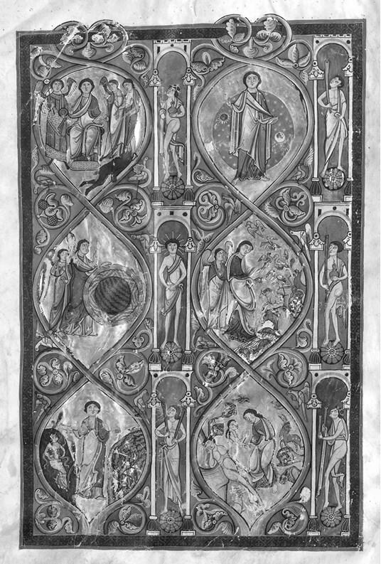 Зальтен вслед за Хейманн сравнивает персонификации Дней Творения в Верденском гомилиарии с соответствующими сценами в неконцентрическом варианте композиции заставке IN к рукописи «Иудейских древностей» Иосифа Флавия, выполненной в середине XII века[492] (Париж, Национальная библиотека, MS Lat. 5047, f. 2r; илл. 49). Здесь пять из шести медальонов со сценами Творения заняты аллегорическими изображениями Дней с медальонами или «пейзажами Творения». В руке Пятого дня узнаваемый атрибут, роднящий его с предыдущей рукописью, птица. Медальон Шестого дня занят фигурками животных и сценой сотворения Адама и Евы без персонификации Дня. Ян Ван дер Мейлен идентифицирует центральную женскую фигуру с нимбом, предстоящую Творцу в позе оранты, с божественной Премудростью[493], А. Хейманн с Богоматерью, однако она занимает место освященного и благословенного Седьмого дня, и именно ее, придерживая рукой, благословляет Творец. Так же благословляет Творец и персонификацию Седьмого дня в центральном медальоне Верденского гомилиария. Фигуры шести Дней здесь, в отличие от Верденского гомилиария, единообразны и напоминают по типу одновременно и ангелов, и Творца «коттоновского типа»[494]. Это родство доказывается и тем, что трое из Дней держат в руках медальоны Творения. Сама по себе композиция не является концентрической, однако расположение персонификаций Дней в медальонах и полумедальонах по сторонам от Творца указывает на изначальное родство с ней. Замечательно, что здесь внешний медальон окончательно приобрел роль нейтральной, не имеющей отношения ни к Творцу, ни к Творению рамки, готовой принять и более декоративную форму, близкую к форме геральдического щита.