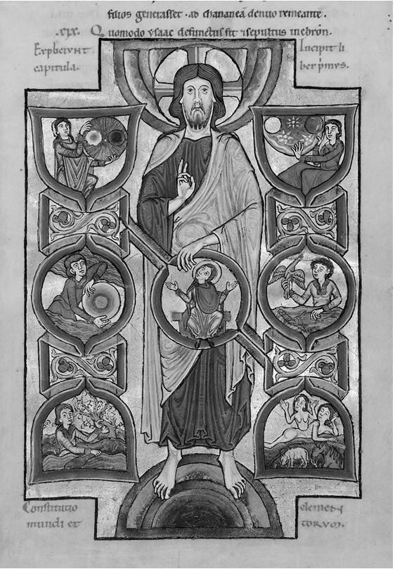 Сама идея представить дни Творения антропоморфно сближает иконографию миниатюры с коттоновским циклом; об их еще более близком родстве свидетельствует центральный медальон, представляющий Седьмой благословенный день в отчетливо коттоновской иконографии, коленопреклоненным перед Творцом.