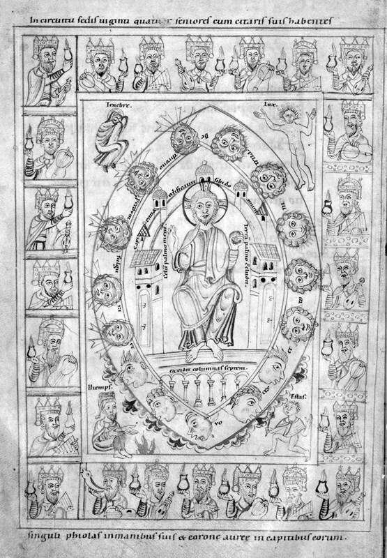 53. Апокалиптическое видение. Книга капитула. (Штутгарт, Вюртембергская библиотека, Brev. 128, f. 9v), 1101 г.