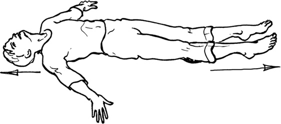 Лежа на спине с закрытыми глазами потянуться, вытянув пальцы ног и откинув голову. Вытянуть шею до конца. Дать максимальную растяжку всему позвоночнику так же, как потягиваются кошки. Руки откинуть в стороны. Длительность упражнения 35 секунд (рис. 1).