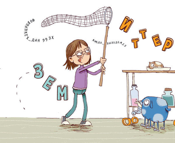 Ну вот, вздохнул профессор. Опять лишних букв налетело! Бардак только хуже становится. Придётся Кумулусу ещё раз мне всё показать, когда вернётся. Теперь только сачок использовать! Подай, пожалуйста. Он там, на крючке висит.