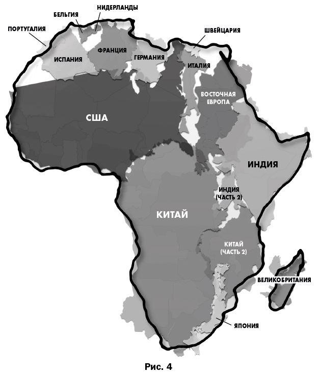 Можно, конечно, усомниться в том, что Африка способна вместить в себя весь этот прогнозируемый прирост населения. Однако не стоит забывать, насколько огромен в действительности Африканский континент. Карты Африки в наших школьных учебниках сильно преуменьшают реальные размеры материка по сравнению с Северным полушарием. На рис. 4 видно, что площадь Африки практически равна сумме площадей Китая, Индии, Западной и Восточной Европы, США и Японии.