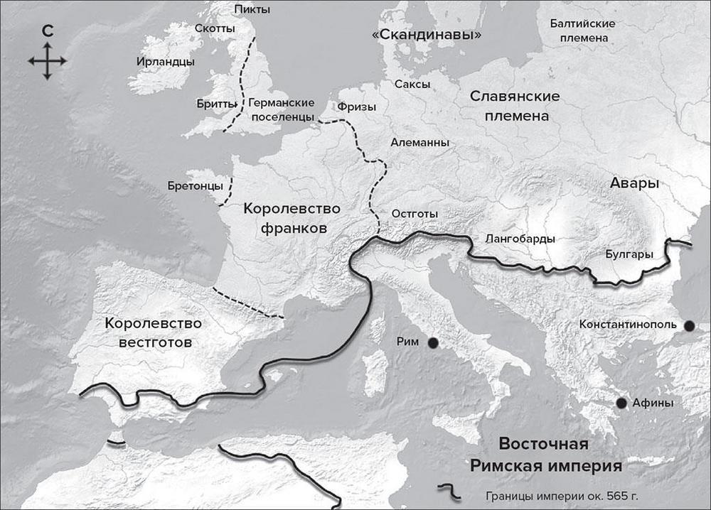 Paris ReviewКарта 1. Упрощенная политическая и демографическая карта Европы ок. 565 г. отражает изменения предшествующих кризисных десятилетий. Границы Восточной Римской империи обозначены на момент после смерти императора Юстиниана (© Neil Price)