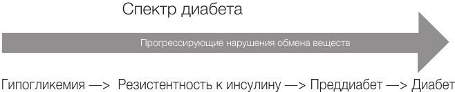 В крайней правой части этого рисунка мы имеем резко выраженный диабет 2-го типа. Непосредственно предшествующее диабету состояние, которое мы видим в спектре слева от диабета, называется преддиабет. Слева от него мы видим состояние, которое называется резистентностью к инсулину (инсулинорезистентностью). А слева от этого, в самой левой части спектра состояние, которое называется гипогликемией.
