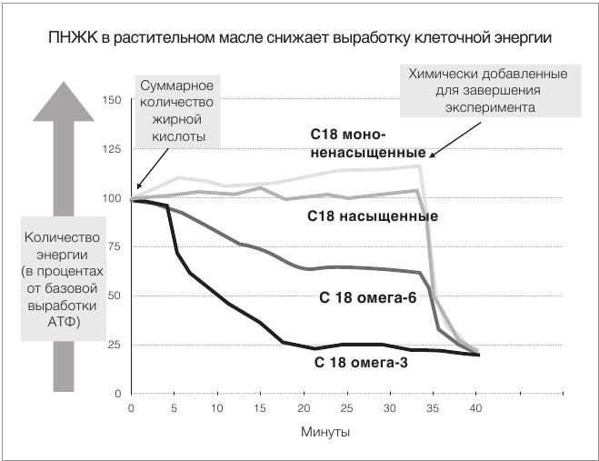 А когда они проверили самую нестабильную жирную кислоту омега-3 ПНЖК с очень похожим названием «линоленовая кислота», которая является основной полиненасыщенной жирной кислотой в масле канолы, то увидели, что свет датчика мерцает и почти гаснет, поскольку выработка митохондриальной энергия упала до мизерных 20 процентов от нормы.