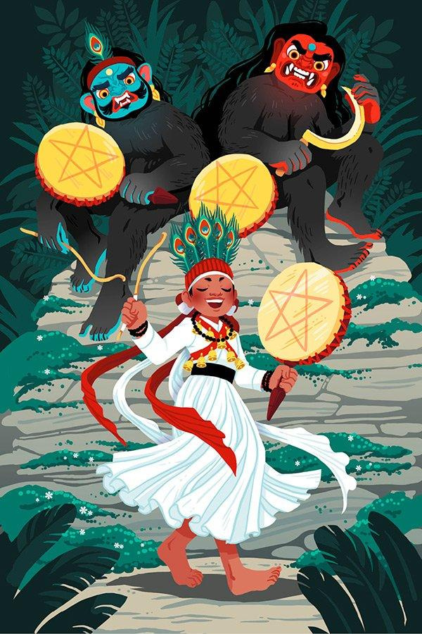 Банджакри все время искал себе новых учеников, чтобы воспитать из них великих шаманов, однако угодить ему было нелегко. Он выбирал детей, у которых на теле нет ни шрамов, ни других отметин. Приглянувшегося ребенка он похищал, отводил к себе в пещеру и подвергал суровым испытаниям. Некоторые дети рассказывали, что там их заставляли ловить и есть червей, пользуясь лишь тыльной стороной кисти, окунать руки в горячее масло, решать каверзные задачки. Отстающих отдавали на расправу кровожадной Банджакрини с ее золотым серпом. Одни дети возвращались домой в синяках и ссадинах, другие не возвращались вовсе. Но тех, кому удавалось не растерять силу духа и справиться с испытаниями, ждала щедрая награда. Годы спустя они вновь появлялись в родных деревнях, став настоящими джакри шаманами. Теперь они могли бить в священный бубен дхьянгро, разговаривать с духами усопших, исцелять болезни. Джакри совершали обряды на свадьбах, похоронах и праздниках урожая, пели, танцевали и били в бубны. Еще они позволяли духам вселяться в себя, чтобы усопшие ненадолго вернулись в мир живых и поговорили с родными и близкими.