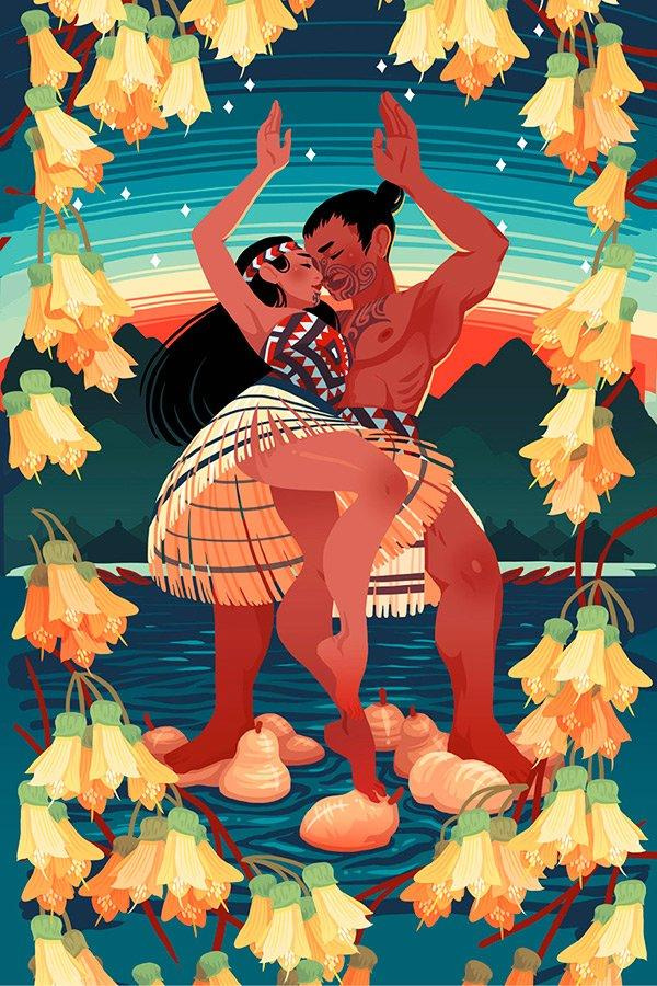 Давным-давно на берегу озера Роторуа в Новой Зеландии жил великий вождь. У него была красавица дочь по имени Хинемоа. Многие юноши мечтали взять ее в жены, но она отдала свое сердце Тутанекаи. Он тоже любил Хинемоа, но знал: его род хоть и хорош, но слишком беден, чтобы вождь согласился отдать ему дочь. Он ведь не был даже тохунга колдуном, который может приворожить девушку, заставив распуститься цветок коухаи. Поэтому он глядел на возлюбленную издалека (а жил он посреди озера на острове Мокоия и видел ее нечасто). Наконец Тутанекаи признался Хинемоа в любви, а она в ответ открыла юноше свои чувства. Влюбленные понимали, что навлекут на себя гнев вождя, но все равно решили пожениться. Они договорились, что Хинемоа среди ночи возьмет одну из отцовских лодок и поплывет на остров к Тутанекаи, а юноша будет играть на флейте, чтобы она знала, куда грести в темноте.