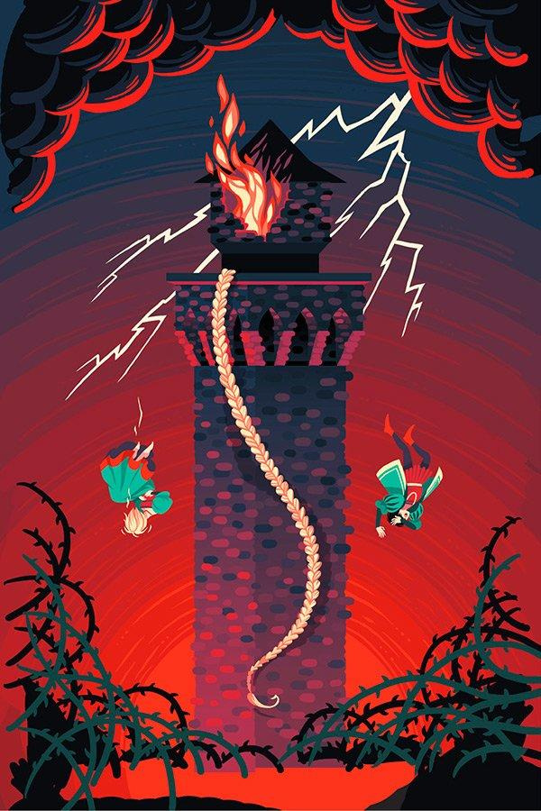 Вернувшаяся ведьма почуяла подвох и пришла в ярость. Она остригла косы Рапунцель и выгнала ее в лесную чащу. Когда принц пришел за возлюбленной, ведьма столкнула его с башни в заросли терновника, и шипы выкололи юноше оба глаза.