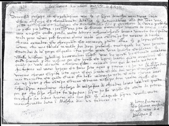 «Светлейшему Князю и превосходительному Господину моему, которому, где бы я ни был, желаю служить всячески. Находясь снова в великом Государстве, в городе славнейшем, богатейшем и торговом (в Москве. Авт.), я выехал на 1500 миль далее, до города, именуемого Ксалауоко (по мнению Хрептовича, это Соловки. Авт.) в расстоянии 5000 миль от Италии, с единой целью достать кречетов (в тексте именно кречет, zirfalco вид falcone, сокола. Авт.). Но в этой стране путь верхом на лошади весьма медлителен, и я прибыл туда слишком поздно и не мог уже достать белых кречетов, как того желал, но через несколько времени они у меня будут, белые, как горностаи, сильные и смелые. Покамест через подателя этого письма, моего сына, посылаю тебе, светлейший князь, двух добрых кречетов, из которых один еще молод и оба хорошей породы, а через немного линяний они станут белыми. <> Я всегда бодр и готов исполнить дело, достойное твоей славы, почтительнейше себя ей поручая. Дано в Москве 22 февраля 1476. Твой слуга и раб Аристотель, архитектор из Болоньи, подписался.»