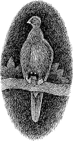 Мы могли разглядеть перевернутую голову мохноногого вампира, выглядывающую из-за покрытой перьями груди цесарки.