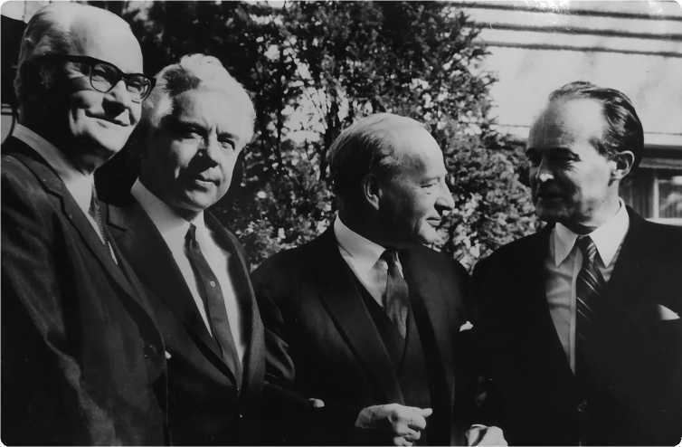 Участники четырехсторонних переговоров (слева направо): К. Раш посол США в ФРГ; П. А. Амбросимов посол СССР в ГДР; Р. Джеклинг посол Англии в ФРГ; Ж. Сованьярг посол Франции в ФРГ.