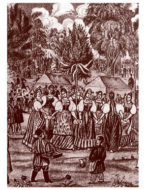 Празднование Семика. В центре ритуальная береза. Лубок (фрагмент). XIX в. Грачев А. Семик, или Гулянья в Марьиной роще. 1845. (Wikimedia Commons).