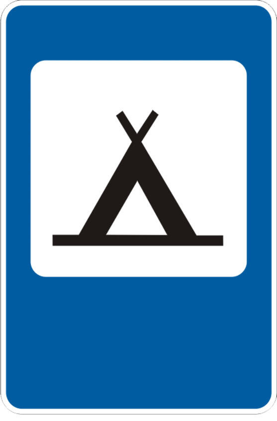Знак 7.10 «Кемпинг» информирует об оборудованном и охраняемом летнем лагере для автотуристов с площадками для установки палаток и местами для стоянки автомобилей.