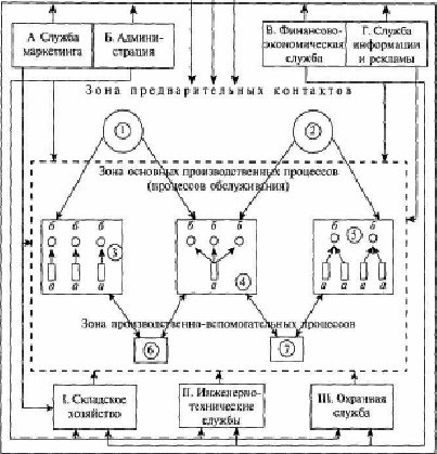 А, Б, В, Г, I, II, III вспомогательные службы; 1,2 структуры предварительного приема посетителей и оформления заказов; [1, 2] зона непосредственного обслуживания потребителей; 3, 4, 5 подразделения непосредственного обслуживания потребителей с разными схемами взаимодействия между производителями услуг и клиентами; а место работника предприятия; б место клиента; 6, 7 подразделения, выполняющие вспомогательные функции в процессе непосредственного обслуживания